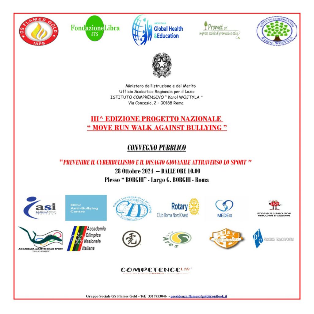 Presentazione del progetto nazionale “MOVE RUN WALK AGAINST BULLYNG” il percorso educativo triennale dedicato al problema della violenza e del bullismo a scuola che si pone l’obiettivo di promuovere un cambiamento culturale e favorire le dinamiche di comunicazione tra i ragazzi, anche in rete.